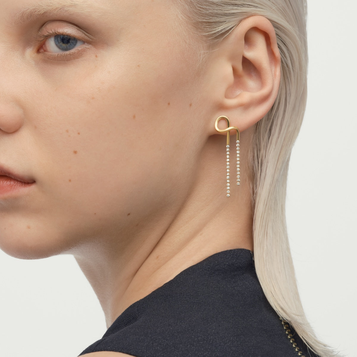The flowing curved gold, and the diamonds set on the tennis chain extending from it, giving lively feeling every time you move.Material:18K yellow gold / diamondsProduct Number:ak1984010400Collection:chandelierCarat:diamond approx. 0.33 caratSize:(single earring)design for left ear / total length approx. 42 mm