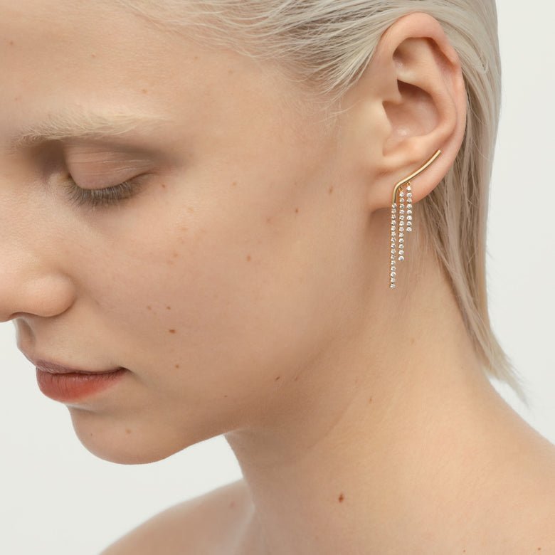 設計為沿著耳垂邊緣的貴金屬線條,延伸一排排鑲嵌著璀璨鑽石的網球鏈,極致耀眼。